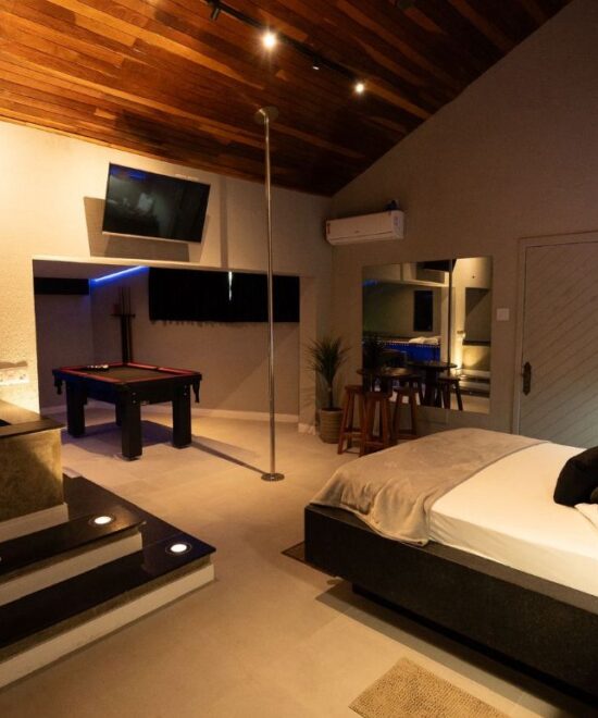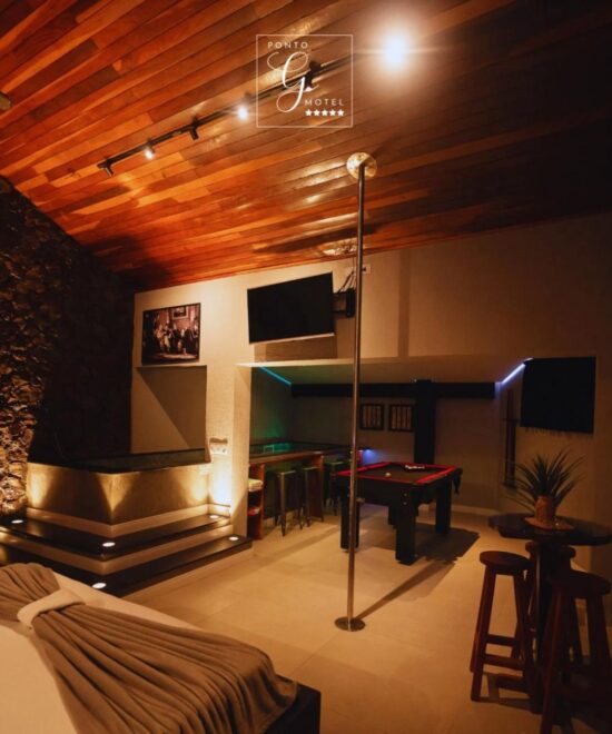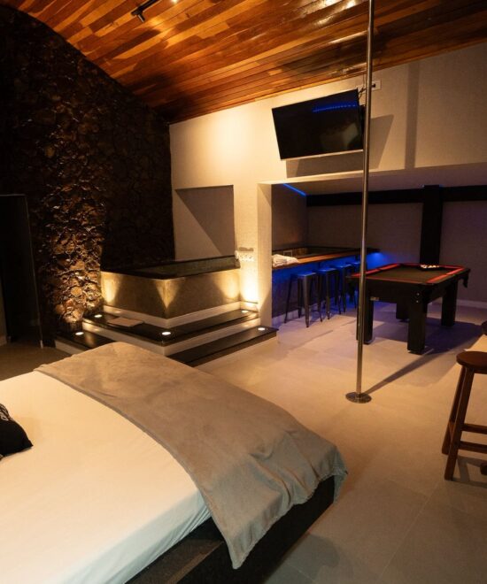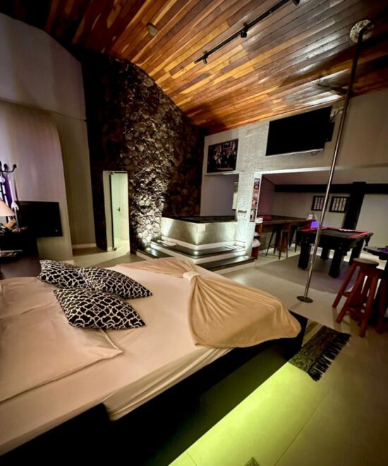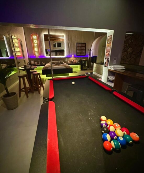 Todas as suítes possuem ar condicionado, Wifi, TV, Serviço de Quarto (para bebidas e refeições) Snacks e Sex-shop.