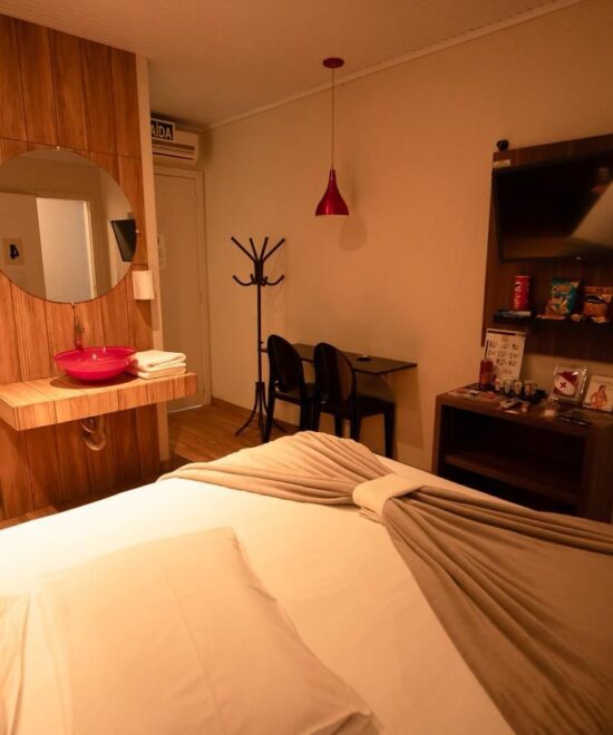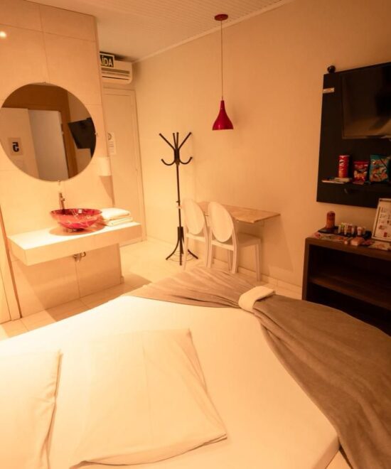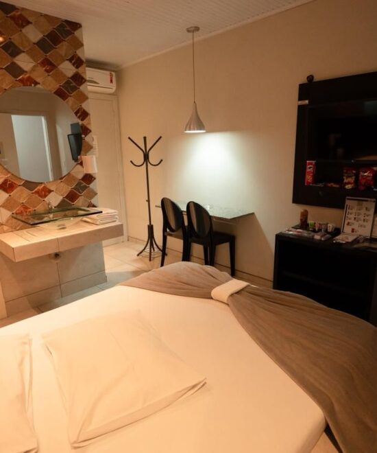 Todas as suítes possuem ar condicionado, Wifi, TV, Serviço de Quarto (para bebidas e refeições) Snacks e Sex-shop.